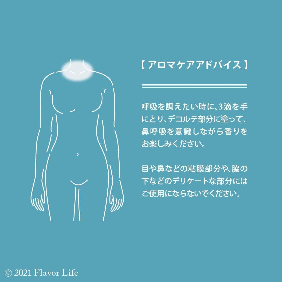 2~3滴を肌に直接塗って、鼻呼吸を意識しながら香りをお楽しみください。